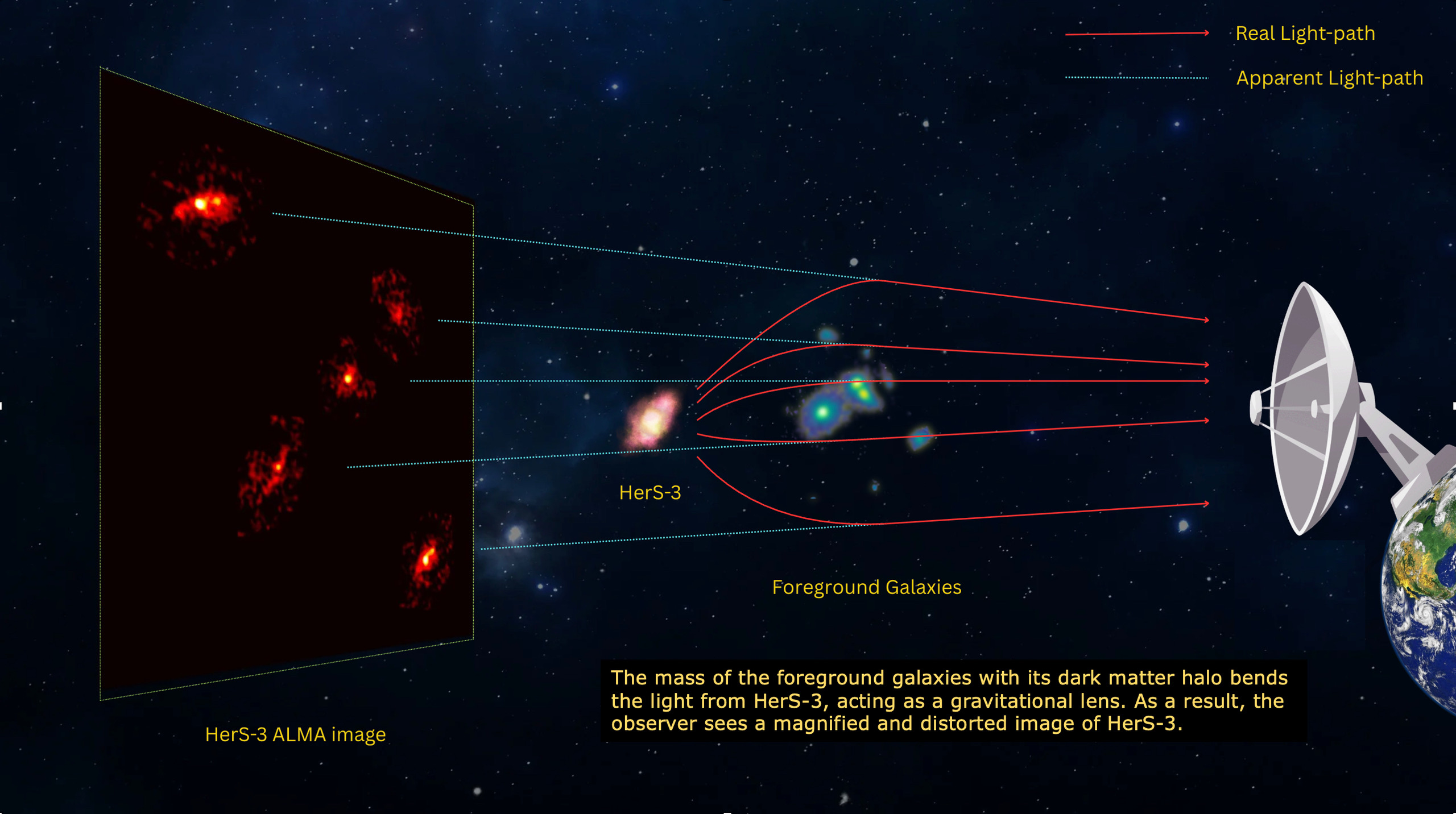 An international team of astronomers has observed a galaxy in the early universe that has the rare shape of an Einstein cross. The Einstein cross is an astronomical phenomenon in which the light of a very distant galaxy is bent by the gravitational force of an intervening galaxy in front of it. This makes the distant object appear to us as if it were several, usually four, images arranged in a cross shape around the galaxy in front of it – an effect known as gravitational lensing. The Einstein cross that has now been discovered also has a fifth central image. The researchers showed that the arrangement of these five images can only be explained by the presence of a dark matter halo associated with the foreground group of galaxies. The results have been published under the title ‘HerS-3: An Exceptional Einstein Cross Reveals a Massive Dark Matter Halo’ in The Astrophysical Journal.