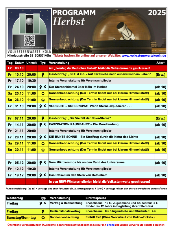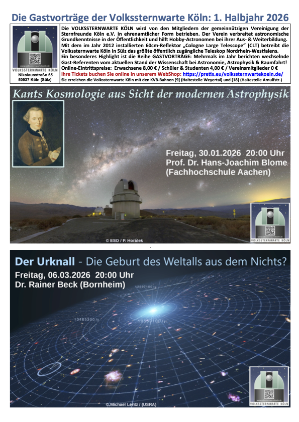 The Public Observatory Cologne is a private institution which is run by the members of the “Vereinigung der Sternfreunde Köln e.V.” on a voluntary basis. This association of interested amateurs and amateur astronomers was founded in 1922 with the aim of disseminating basic astronomical knowledge to the public and promoting the training and further education of active amateur astronomers within the scope of the available possibilities.With the 60cm refractor “Cologne Large Telescope” (CLT) installed in 2012, the Volkssternwarte Köln operates the largest freely accessible telescope in North Rhine-Westphalia